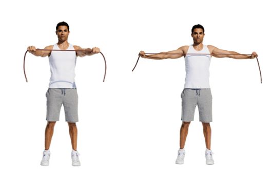 Start by standing on your feet, keep them shoulder-width apart, hold a resistance band, extend your arms in front, and raise them to your shoulder height. Engage your core and pull your fist out to stretch the resistance band you are holding in your hand. Slowly return to the starting point. Now you have completed your first rep. After that, complete two sets with ten reps each. Take a break only when needed. Make sure you perform three sets with five reps each. This exercise will strengthen your upper back and the stabilizer muscle in your shoulder joint.
